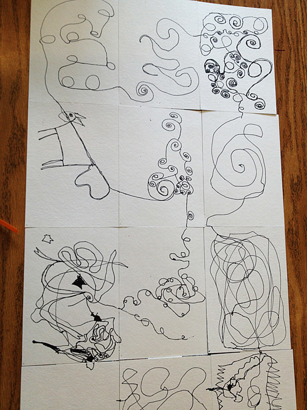 We started with heavy-weight textured vellum cut into 4x6" cards, that were then taped back together. Each kindergartener drew a wire frame on one of the cards that connected tot he one before it and after it. They then filled in selected spaces created by their "frames" with a primary water color. Part two came in walking down to the post office with their teacher to mail their cards in a packet to the fifth graders. The fifth graders wrote an interpretation the wire frame drawing on the front of each card. They sent their cards individually back to the kindergarteners to reassemble. Once reassembled, the cards were put into a frame sandwiched between two sheet of glass so that both side would be seen. The wire frames and colors were also drawn on the glass around the edges of the postcards. This piece was auctioned off to help raise funds for the school's art program.