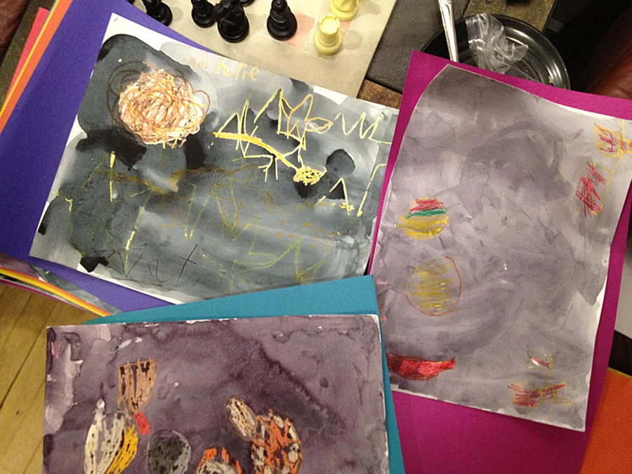The kindergarteners portrayed their understanding of gravity with moonscapes of wax and watercolor. he first graders represented the sound and energy waves with crayon and colored pencil on the back of vellum with images of black holes, Einstein and representations of gravitational wave overlaid on top. They also made an Portrait of Einstein on black velvet with glitter paint just for fun. The fourth graders happened to be studying Einstein as a person and did a series of portraits interpreting Einstein's character based on their research. The fifth graders made nebula inspired spacescapes usingoil pastels and a wax resist with the help of the endlessly creative Mary Pat Zitzer.
